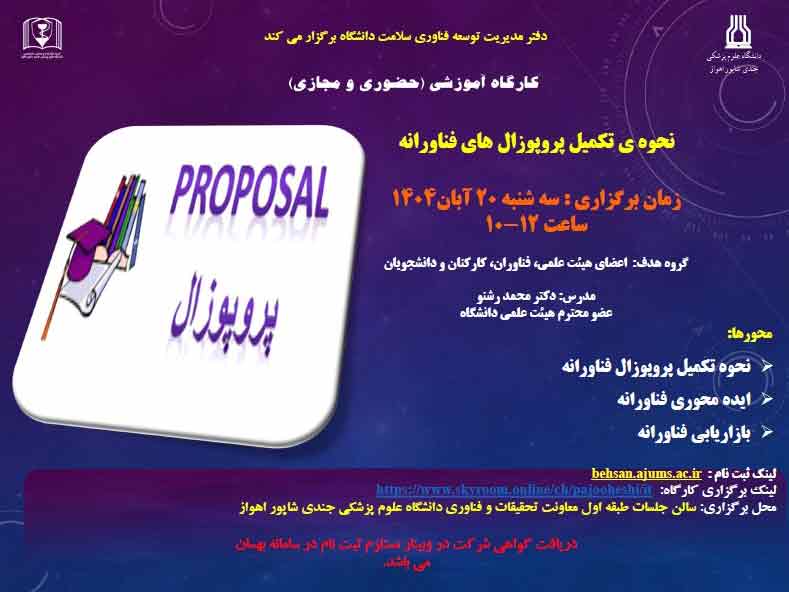 به اطلاع می رساند، مدیریت توسعه فناوری سلامت دانشگاه علوم پزشکی جندی شاپور اهواز در راستای بالا بردن سطح آگاهی و آموزش و رشد فناوری اقدام به برگزاری کارگاه "نحوه ی تکمیل پروپوزال های فناورانه" نموده است که در تاریخ ۱۴۰۴/۸/۲۰ روز سه شنبه ساعت ۱۲-۱۰ در سالن اجتماعات طبقه اول معاونت تحقیقات فناوری دانشگاه به صورت حضوری و مجازی برگزار می گردد.