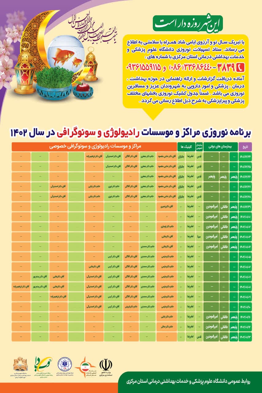 برنامه نوروزی مراکز و موسسات رادیولوژی و سونوگرافی در سال ۱۴۰۲ تعداد بازدید:۷۷۵ ارسال به دیگران نام شما ایمیل شما ایمیل دریافتکننده ارسال انصراف